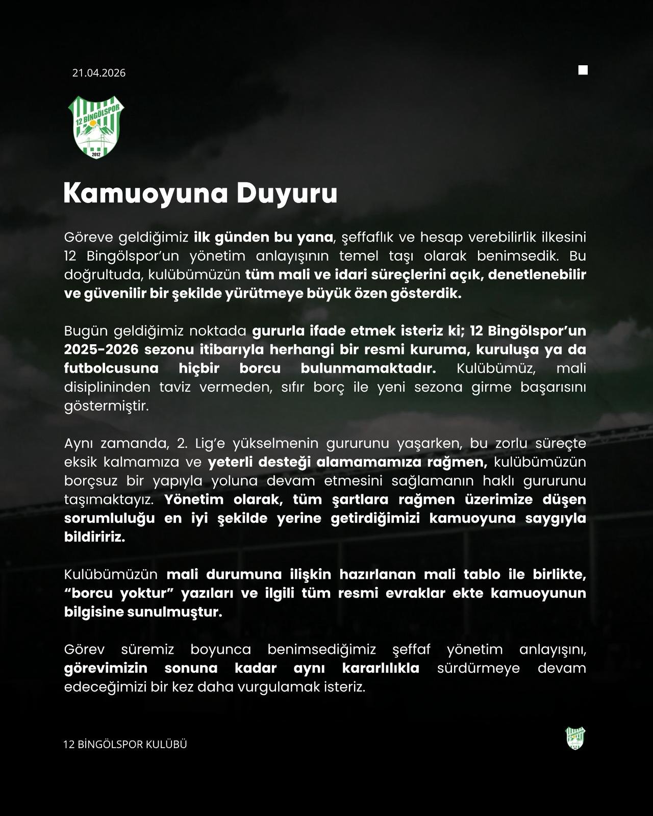 12 Bingölspor’un “Kamuoyuna Duyuru” başlığıyla yayımladığı açıklamada, göreve geldikleri günden bu yana şeffaflık ve hesap verebilirlik ilkesiyle hareket edildiği vurgulandı. Açıklamada, kulübün herhangi bir kamu kurumuna, kuruluşa veya futbolcusuna borcunun bulunmadığı ve yeni sezona “sıfır borç” ile girildiği ifade edildi.