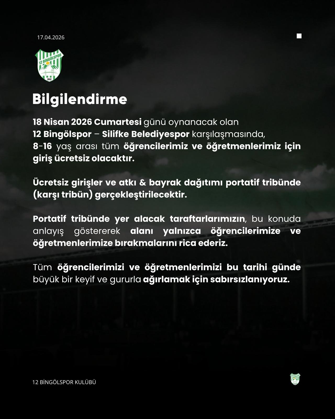 Öte yandan, 18 Nisan 2026 Cumartesi günü oynanacak olan 12 Bingölspor – Silifke Belediyespor karşılaşmasına ilişkin özel bir düzenleme de paylaşıldı. Karşılaşmada 8-16 yaş arası tüm öğrenciler ile öğretmenler için girişlerin ücretsiz olacağı, ücretsiz girişlerin ve atkı-bayrak dağıtımının portatif tribünde (karşı tribün) yapılacağı bildirildi. Kulüp, taraftarlardan bu alanın tamamen öğrenci ve öğretmenlere bırakılması konusunda hassasiyet rica etti.