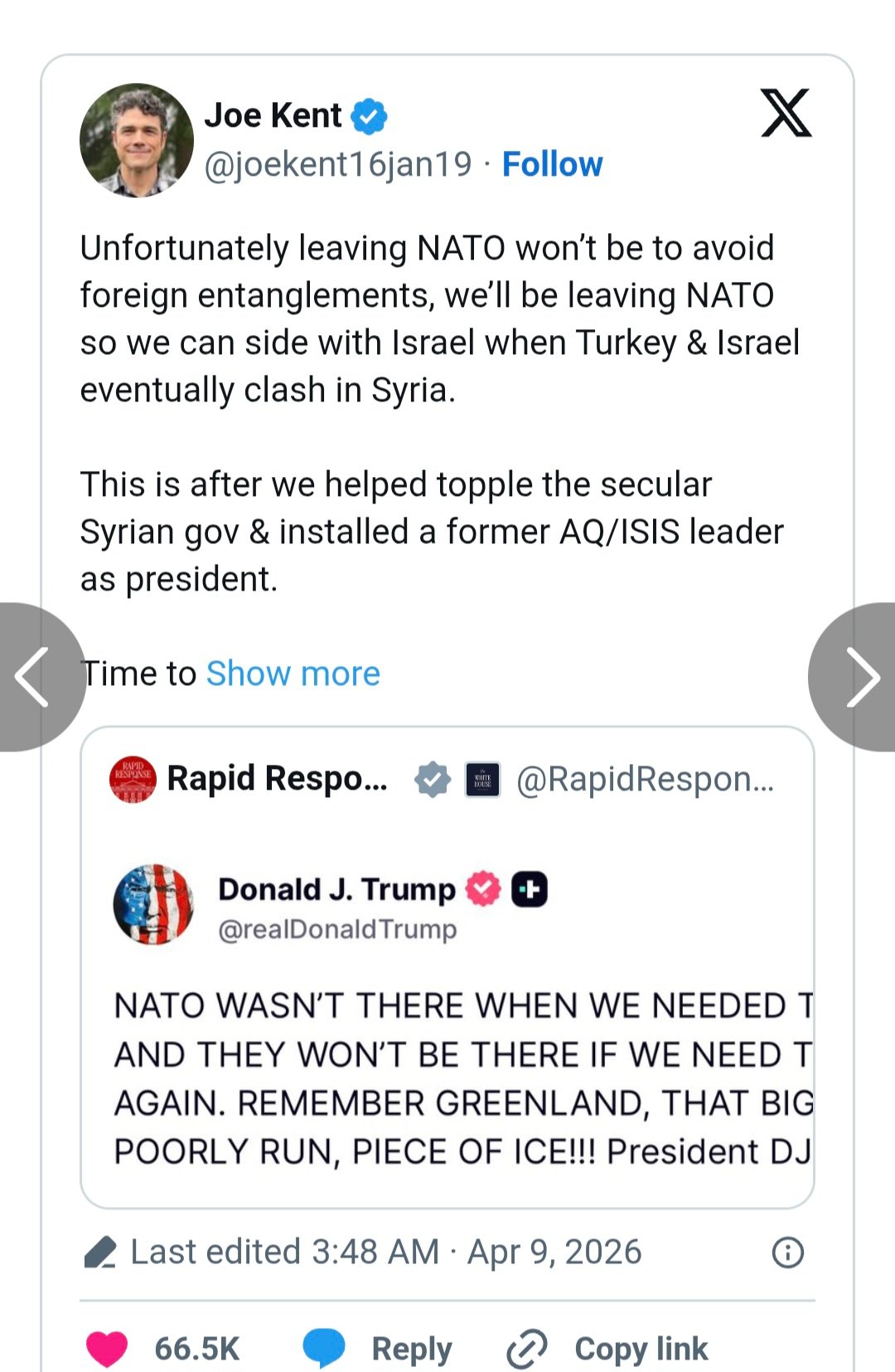 Kent ayrıca, Suriye’deki mevcut siyasi gelişmelere ilişkin eleştirilerde bulunarak, “Tüm bunlar, seküler Suriye hükümetinin devrilmesini sağladıktan ve eski bir El Kaide/IŞİD liderini cumhurbaşkanı yaptıktan sonra gerçekleşiyor” değerlendirmesinde bulundu.