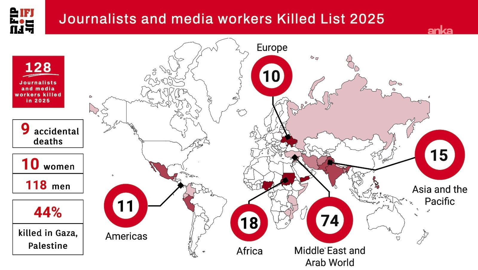 (AH12) – Uluslararası Gazeteciler Federasyonu (IFJ), 2025 yılına ilişkin öldürülen gazeteciler raporunu yayımladı. Rapora göre, 2025 yılı boyunca dünya genelinde 128 gazeteci ve medya çalışanı, mesleklerini icra ettikleri sırada ya da görevleriyle bağlantılı olarak hayatını kaybetti.
